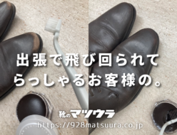 十勝・帯広市の靴屋、靴のマツウラの松浦です、こんにちは。出張で飛び回られてらっしゃるお客様のご来店。靴の先の色が禿げてきて。その場でサッと、メンテナンスを。色を入れたあとは、余分な靴墨を取り除き、艶出しも。ほんのひと手間ですが見違えるほどに。